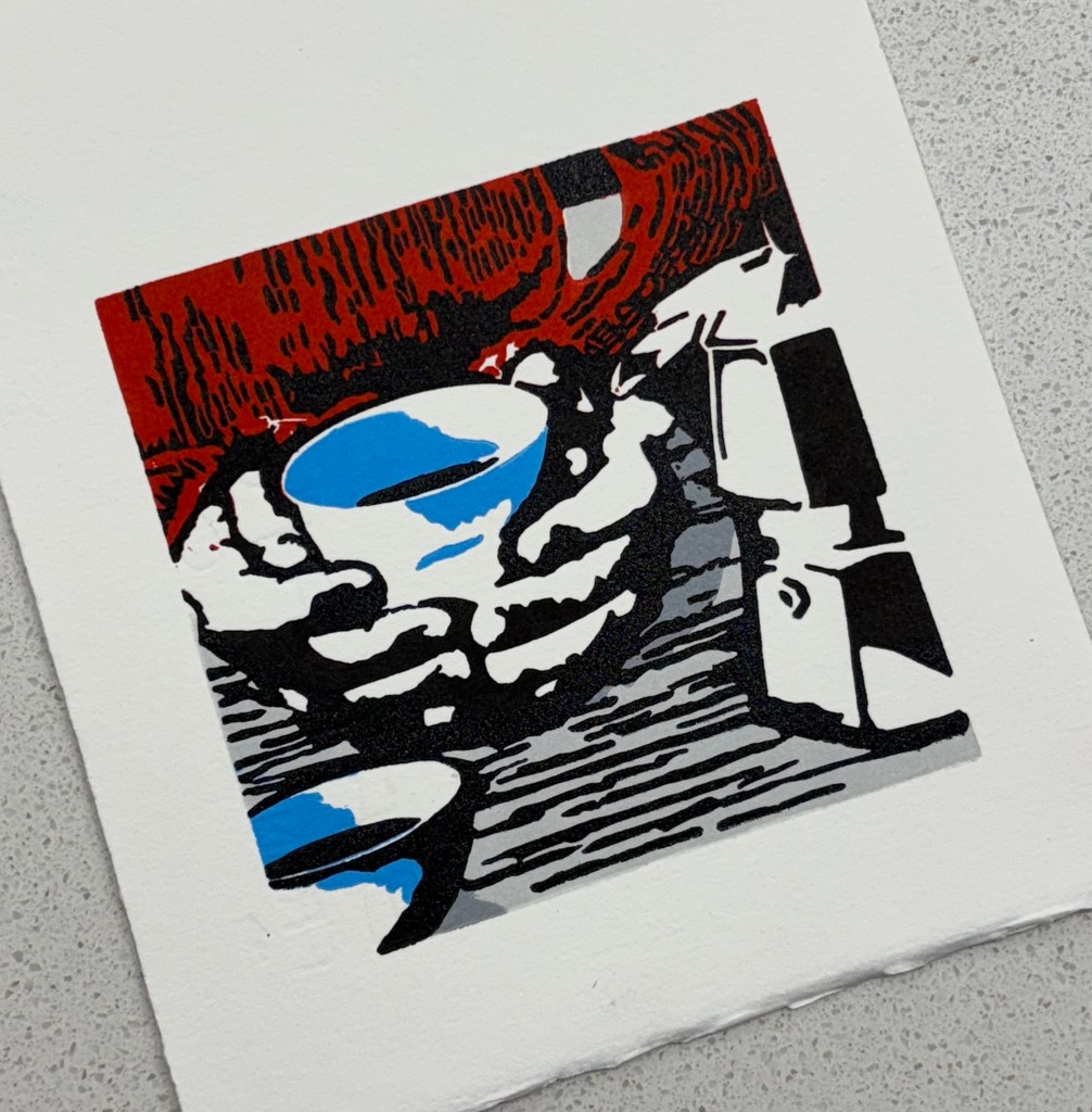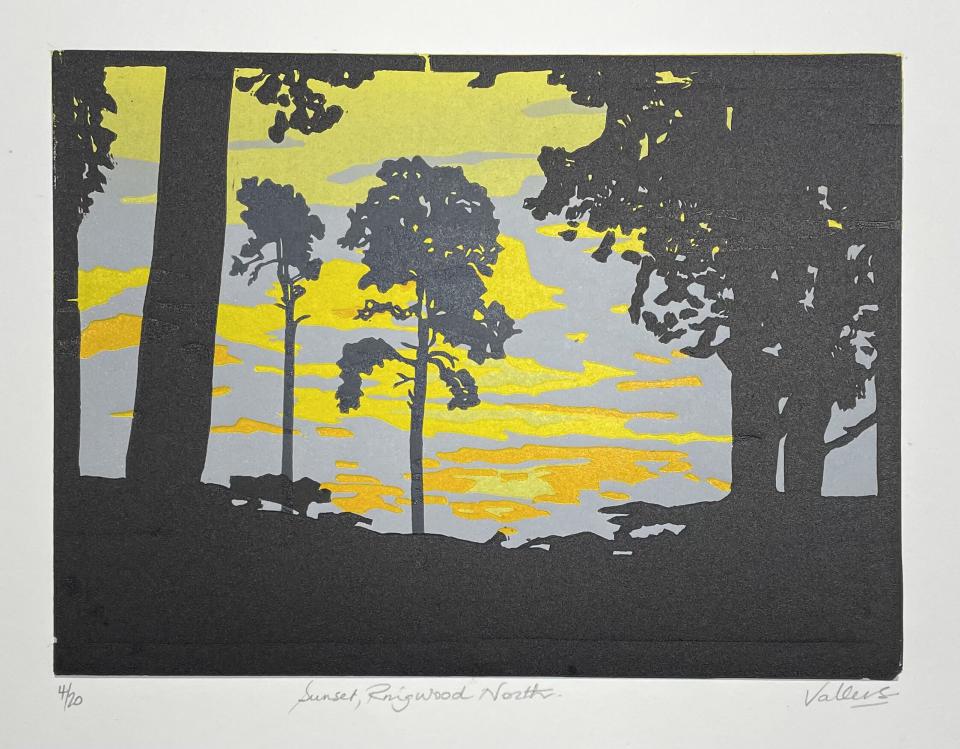 Taken from a chance photograph on my way home from work……our leafy green suburb and the beautiful sunset in the distance. All colour is applied through the reduction printing process. 6 layers.