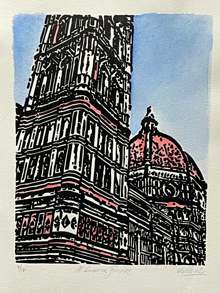 This edition of 10 prints is the full size version of my website logo. The lines of the architecture can be seen more clearly and the pops of colour added using watercolour are a nod to the colour the Duomo is noted for.