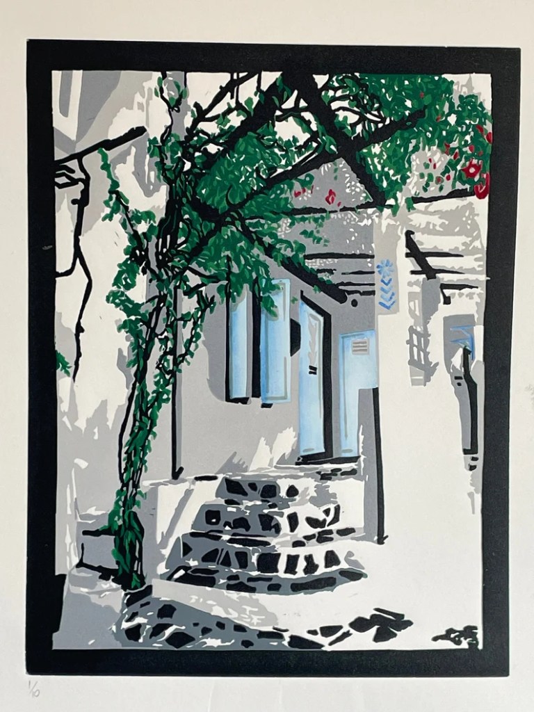 This limited edition of prints was inspired by recent travels to Greece. I loved the bougainvillea that is so prevalent throughout the island and the contrast it created with the white buildings of the town. The unique stone paving is so recognisable. Colour has been added both through the reduction process (5 layers) and watercolour paint. There are only 5 left.