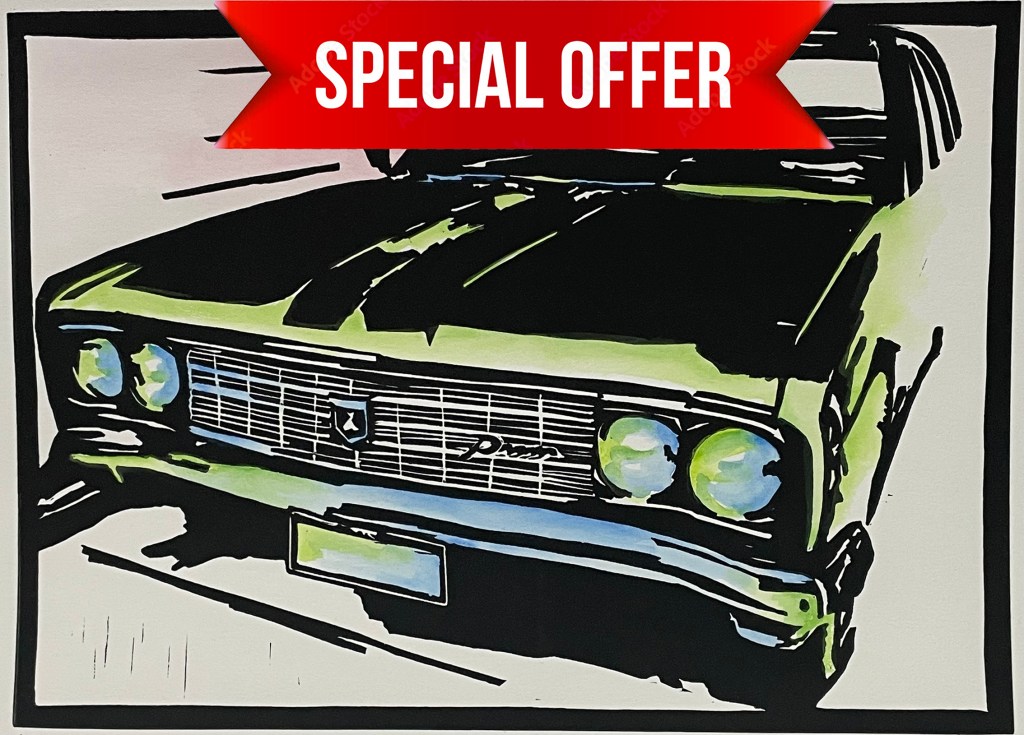 This very special car is a 1970 Holden Kingswood Premier. It is based on my partner’s pride and joy. There is only ONE LEFT framed and ready to hang at this very special price!