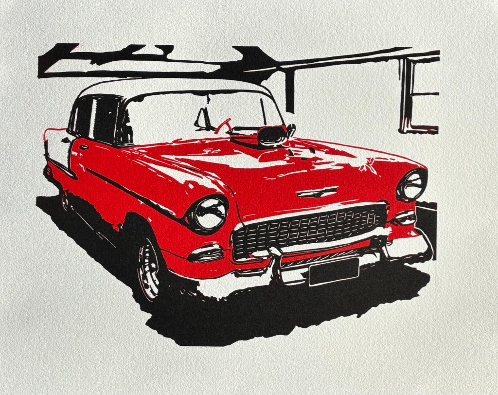 This is a small edition of of just 6 reduction prints of what I would consider my most favourite car of all time: the 56 Chevy. And it has to be a red one!!
